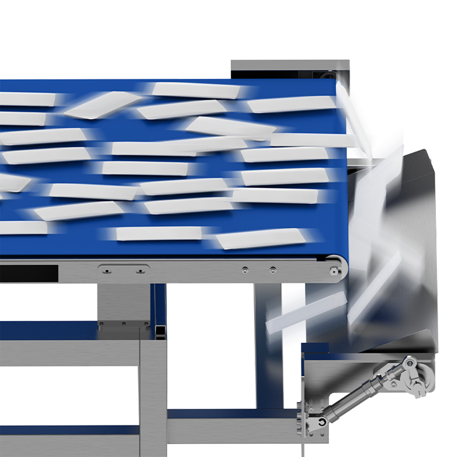 剔除工位处的翻板以垂直于输送带的轴为中心实现上下摆动,初始状态下翻板与输送带平面平齐,确保产品顺畅通过;当检测系统识别到不合格产品后,控制系统根据产品实时位置和流水线速度,精准触发翻板驱动机构,翻板绕轴向下摆动形成倾斜通道,不合格产品在自身惯性及翻板引导作用下滑入下方剔除收集装置;待不合格产品完全脱离主输送带后,翻板迅速向上复位至初始位置,避免影响后续合格品输送。