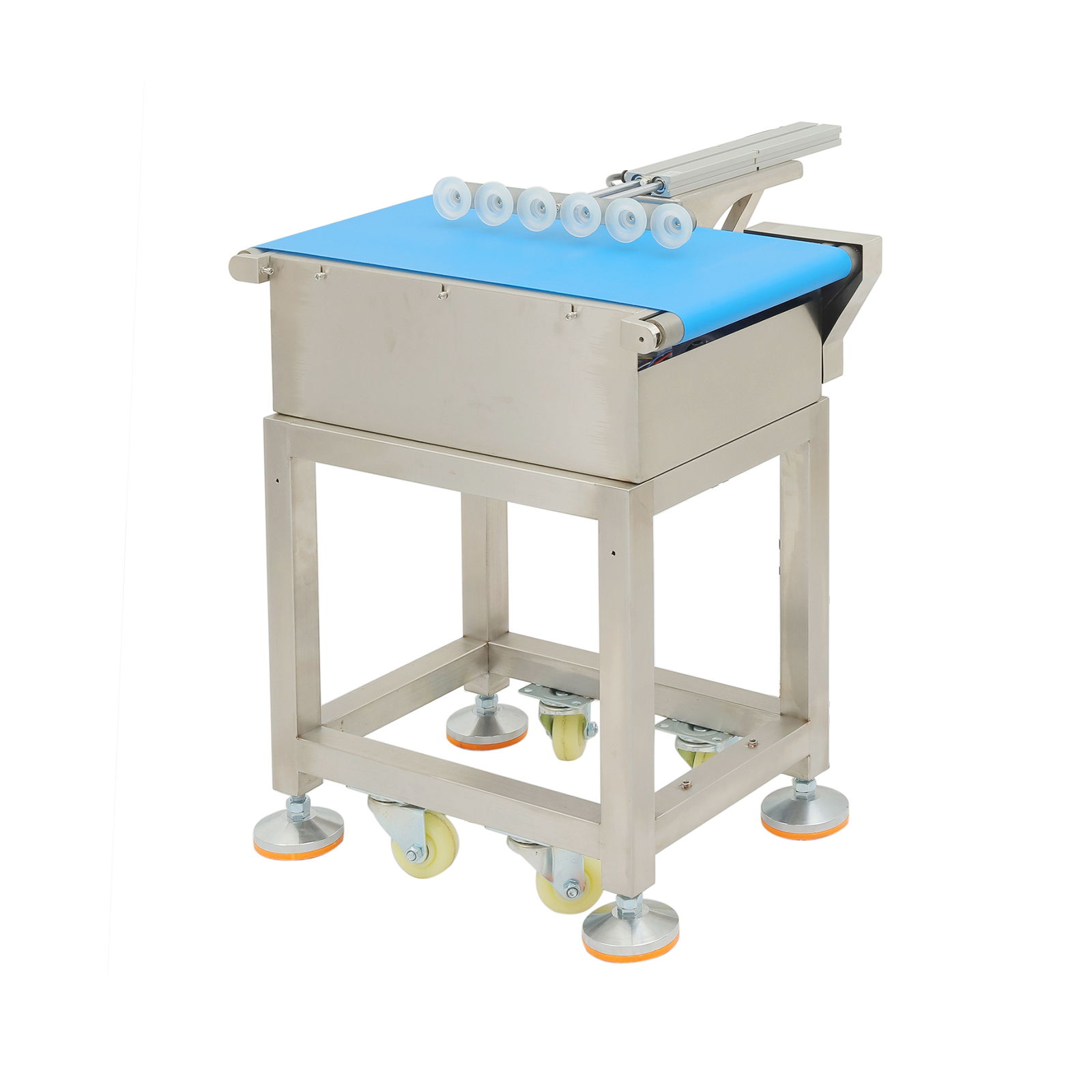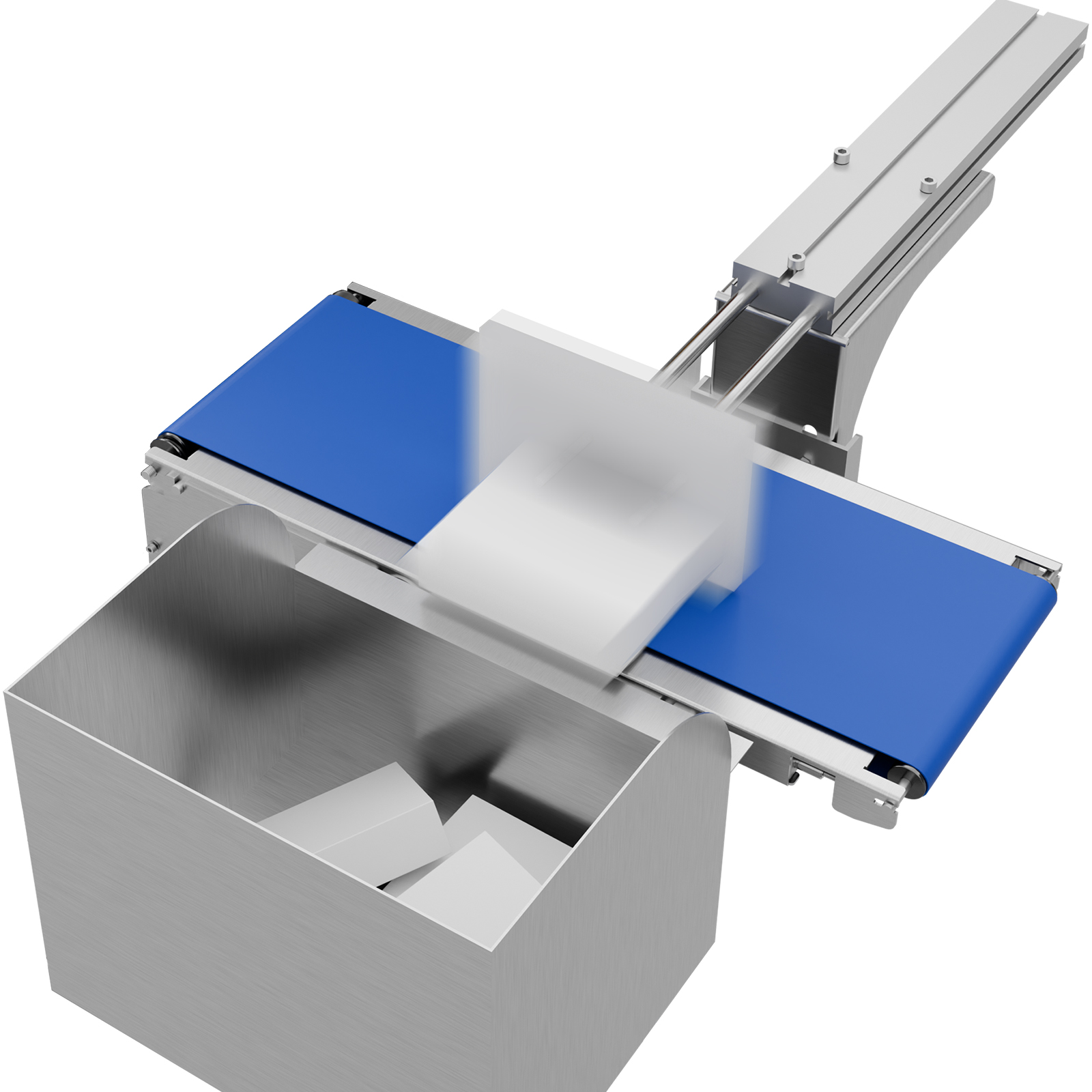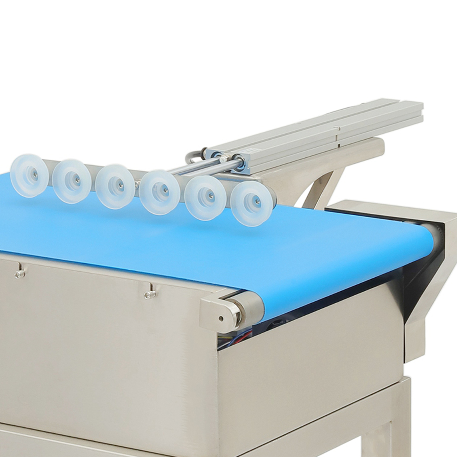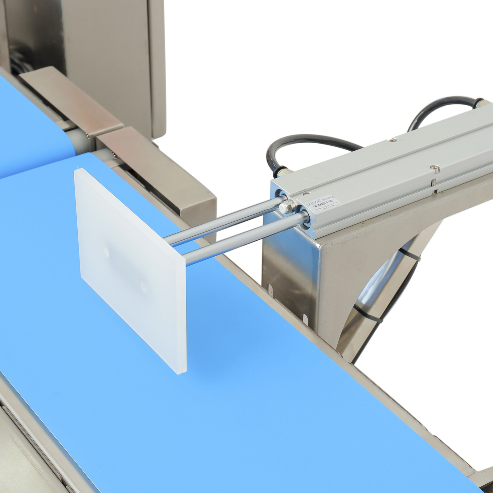 检测系统识别到不合格产品后,结合流水线输送速度计算产品到达剔除工位的时间,提前向驱动装置(气缸或伺服电机)发送动作信号;当产品到达指定位置时,驱动装置带动推杆沿垂直于输送带的方向快速伸出,将产品推离输送带至剔除收集区;完成剔除后,推杆迅速复位,等待下一个不合格品信号,整个过程与流水线运行节奏精准同步。
