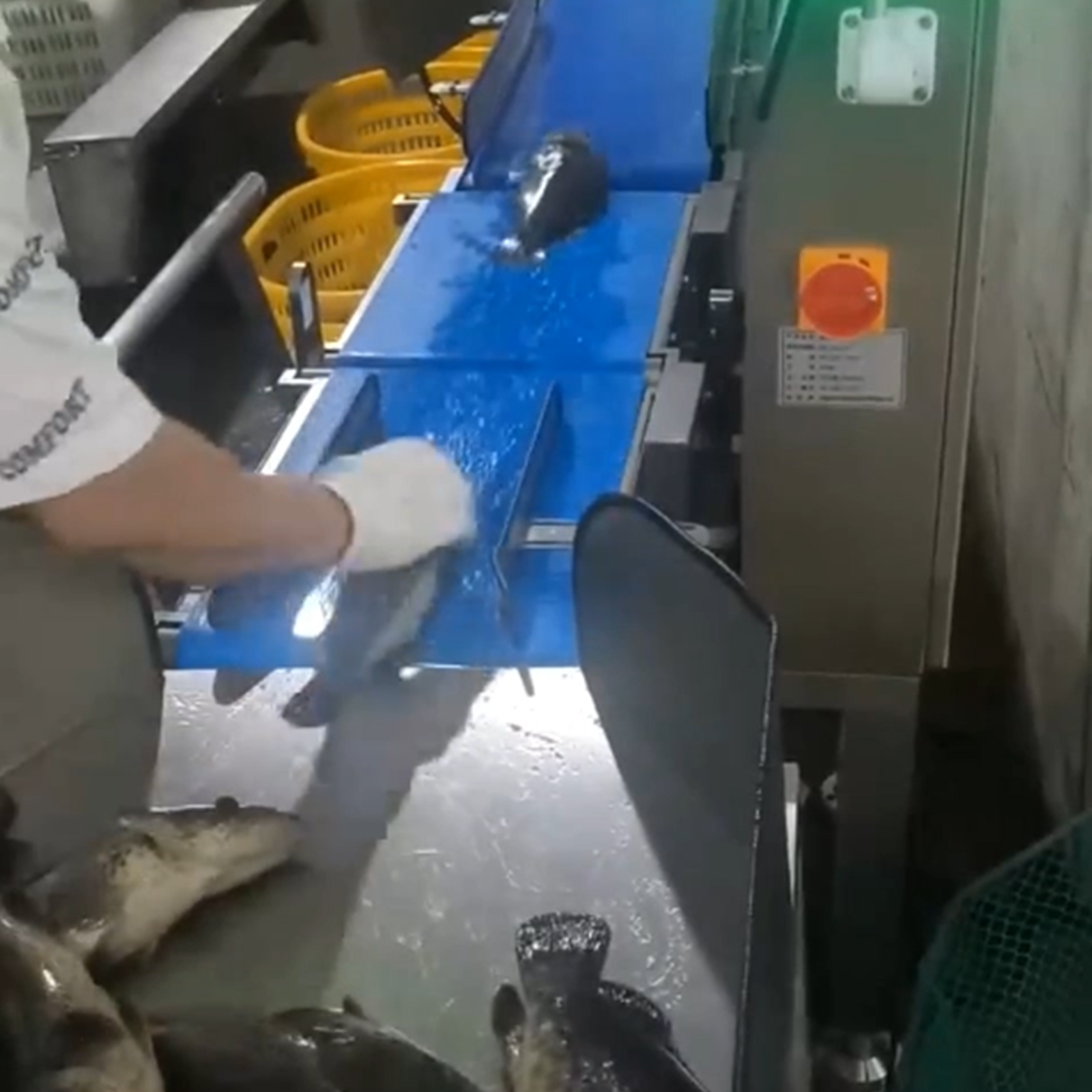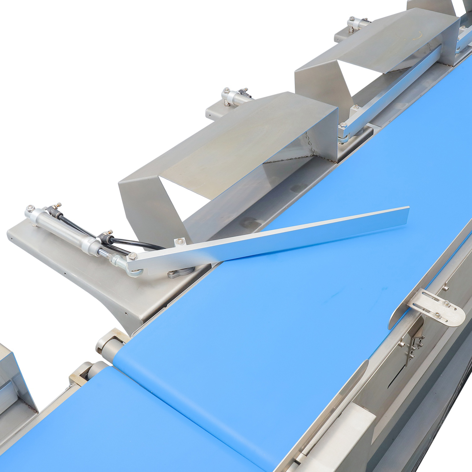 适用于形态偏扁平、长条或具有一定刚性的产品,如水产海产里的鱼、海参、鲍鱼,以及禽肉加工中的白条鸡、白条鸭,或是鸡翅、鸡腿、猪蹄等需要分选的场景;其结构紧凑、占用空间小的核心优势,也使其能完美适配流水线两侧空间有限的生产场景。