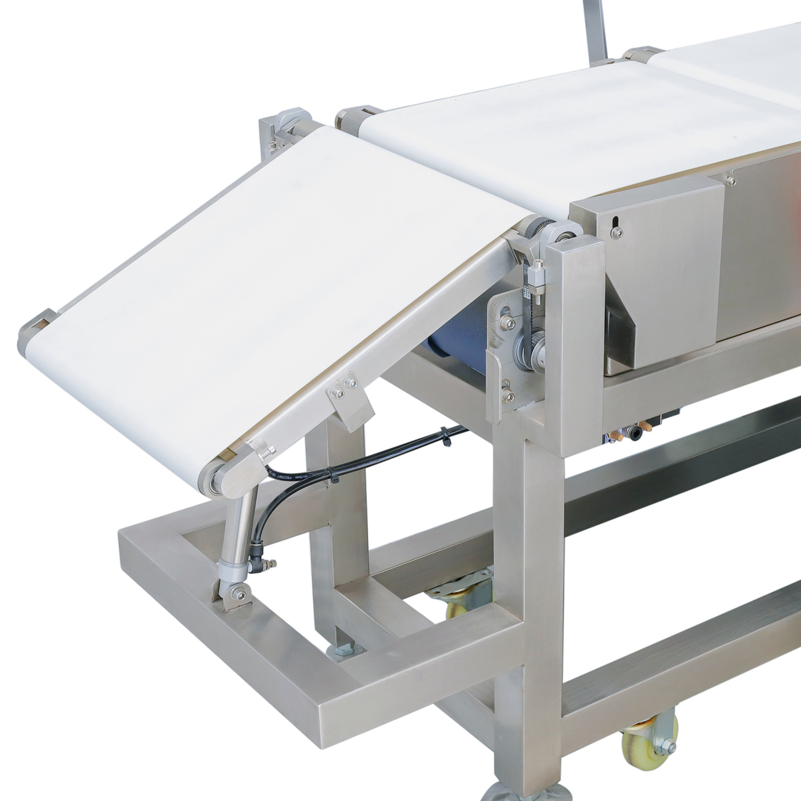 流水线剔除工位处的输送带采用分段式设计,中间段为可升降的活动输送带;检测系统识别到不合格产品后,向升降驱动机构(如液压杆、电动推杆)发送信号,当不合格产品运行至活动输送带上方时,驱动机构带动活动输送带快速下沉,形成与下方收集箱连通的通道,不合格产品在惯性和重力作用下落入收集箱;合格品到达时,活动输送带保持与主输送带平齐的状态,确保输送顺畅;剔除完成后,活动输送带迅速回升复位。